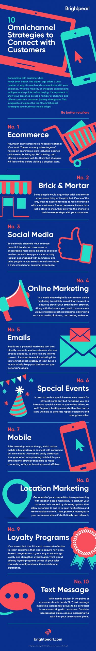 Connecting with customers has never been easier. The digital age offers a vast number of ways to reach and communicate with your audience. With the majority of shoppers experiencing multiple touch-points before buying, it’s important to show your presence across a number of channels and offer a consistent customer journey throughout. This infographic includes the top 10 omnichannel strategies your business should adopt.
