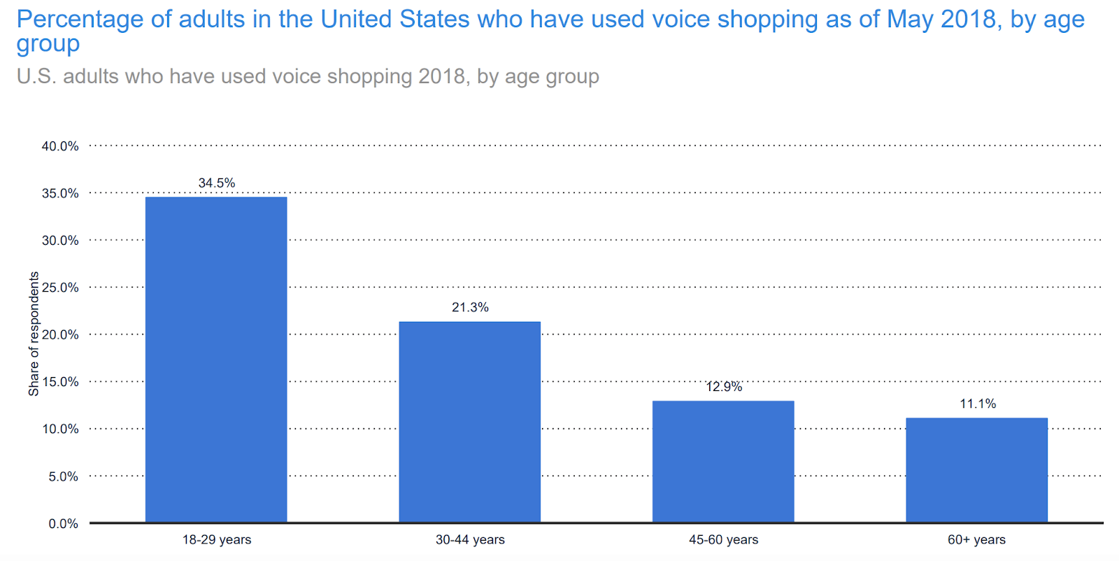 Are your products conducive to online voice ordering? Buying a product for the first time, especially products that consumers typically want to see before purchasing, can be a bit of a leap for customers at this point. You should also be sure your target audience even wants to use voice to shop. A survey from 2018 showed that the greatest percentage of voice commerce users (34.5%) were between the ages of 18–29; the percentages decreased across older age groups.