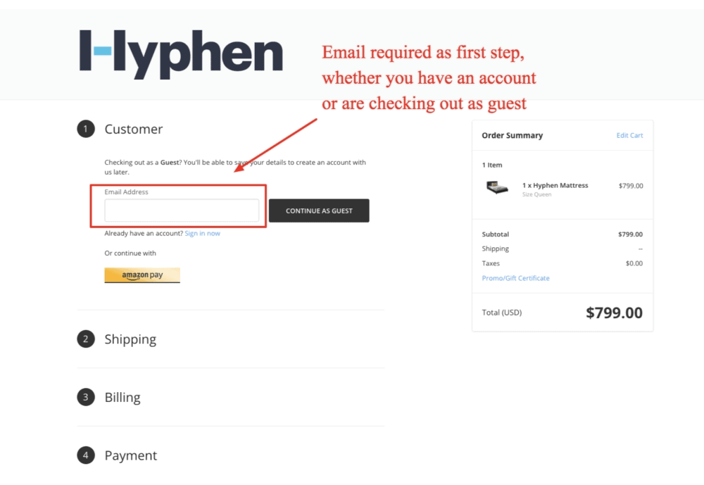 The sooner you have the buyer’s email address, the better. If a customer abandons the checkout process at some point after entering an email address, you can follow up with abandoned cart email campaigns to try to convince them to return to purchase.