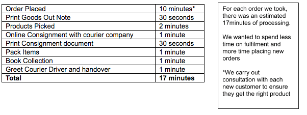 As the table shows, we had too much time being tied up on the fulfilment stage of order handling. When we received 10 orders in a day, someone had to spend half their day processing the sales. When we received 20 or 30 or 40 orders it was all hands on deck; nothing else go done.