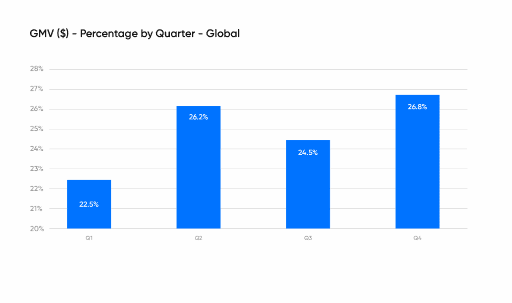 The trend means that the closing months of the year are now more important than ever. In terms of total spending for 2017 (gross merchandise value), the fourth quarter accounted for 26.8% of total sales. Q1, meanwhile, was the quietest, with total spend for the quarter representing 22.5% of the total spend in 2017.