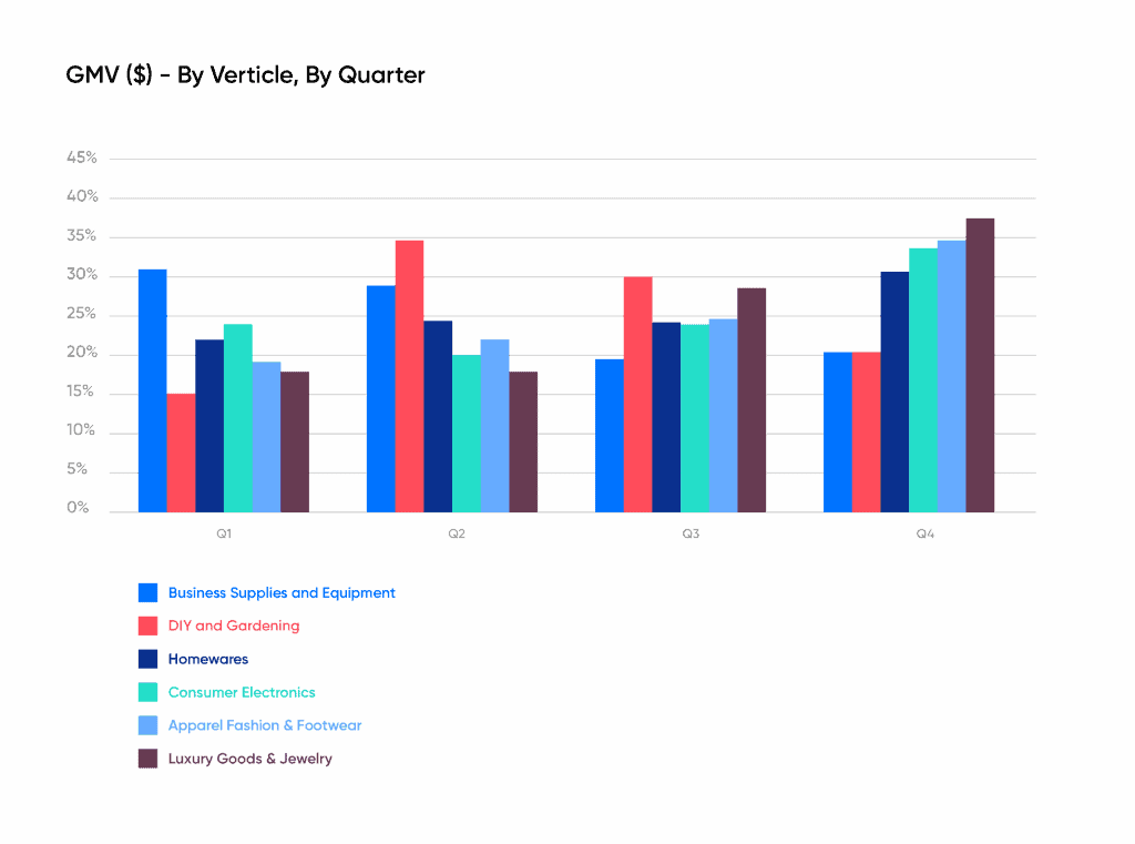 The importance of end of year sales varies significantly when the data is split by different verticals. For Homewares, Consumer Electronics, Apparel Fashion and Footwear, and Luxury Goods and Jewelry, Q4 represents more than 30% of total annual sales and, with the exception of Homewares, the quarter accounted for more than one-third of total activity in 2017.