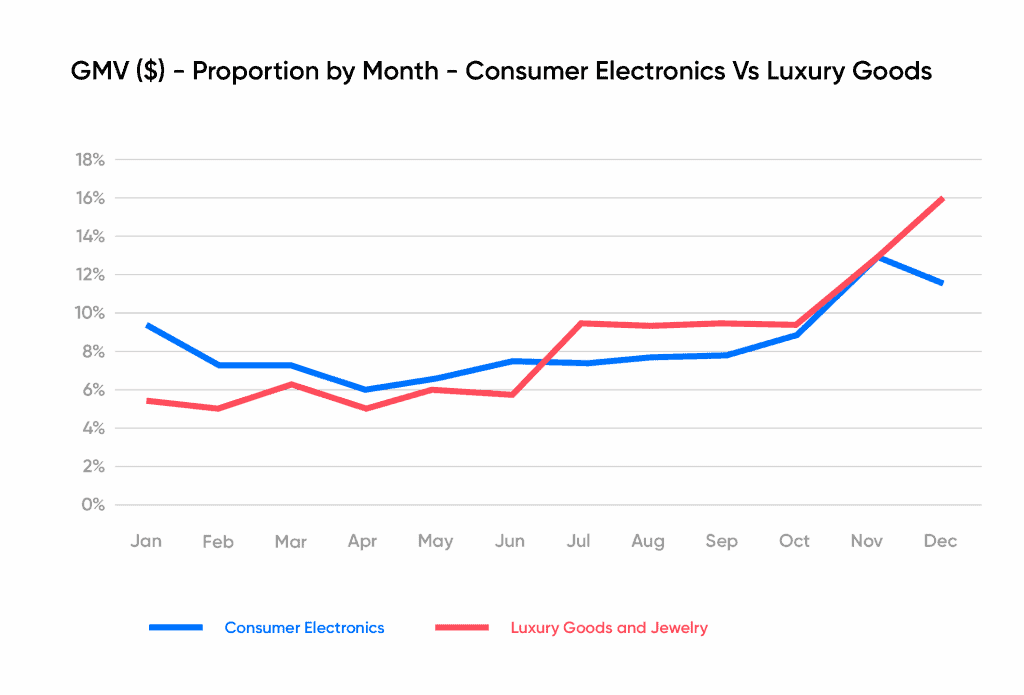 When we look at the impact of the holiday period, in particular late November and December, it is the Luxury Goods and Jewelry sector and the Consumer Electronics verticals that experience the most pressure from end-of-year seasonality, which is revealed in this month-by-month breakdown: