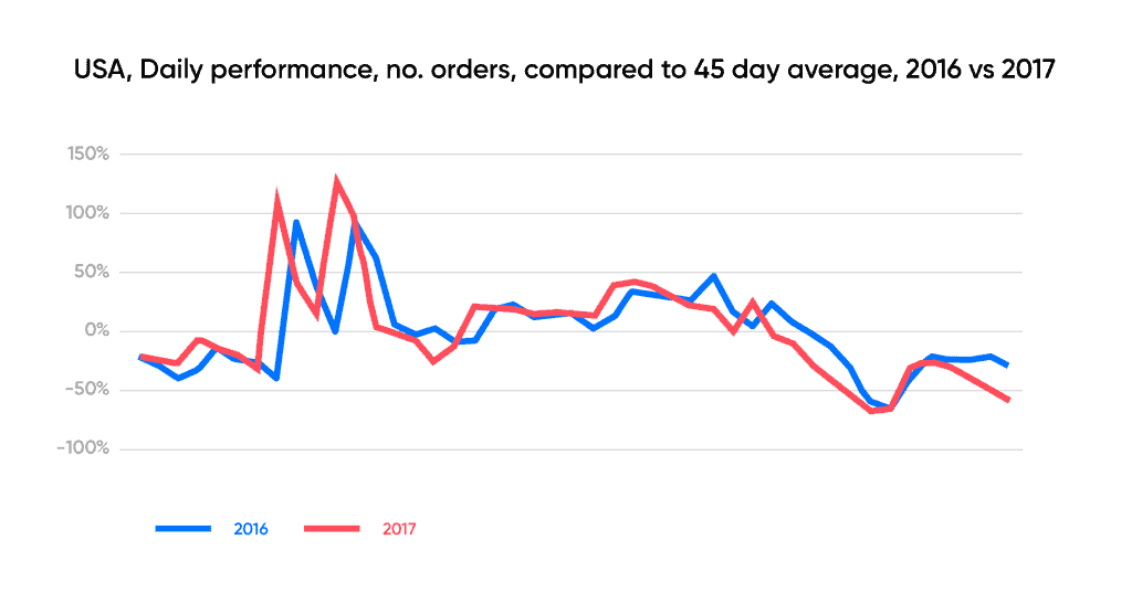 We found there is a growing success for Black Friday sales in the UK market, as it represents a 230% better performance than the 45-day average – up from 209% in 2016. However, we’ve also seen that on quieter days, the average daily performance drops lower than in 2016.