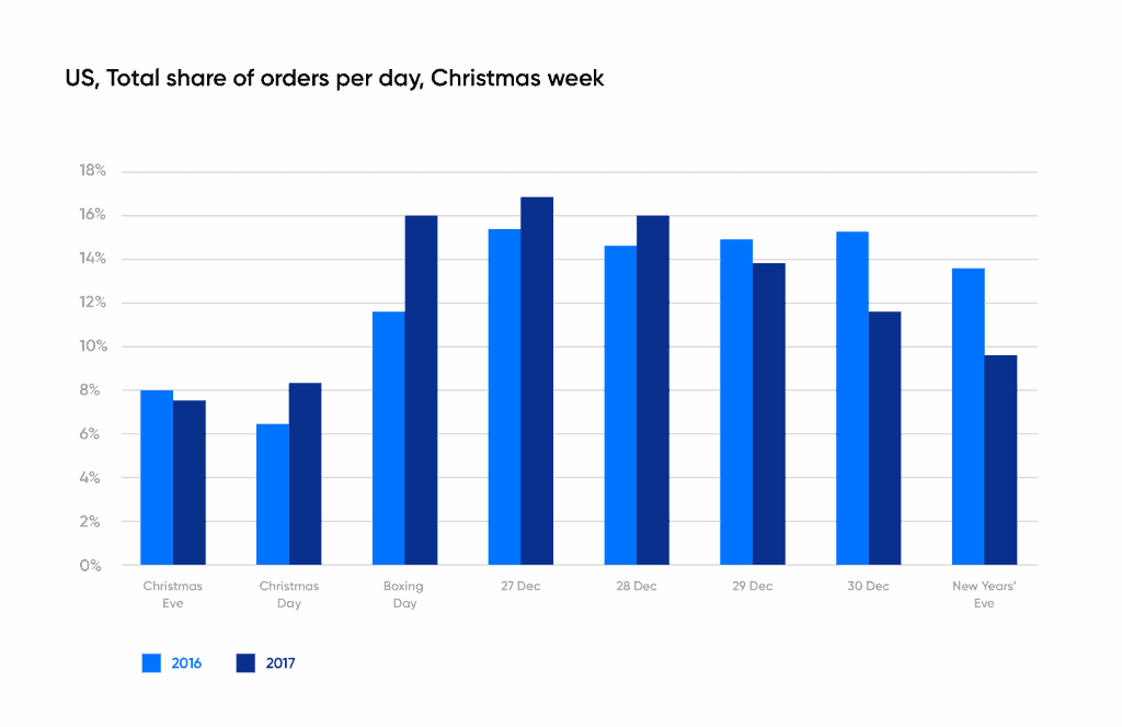 In the United States, it was December 26 that took second position, while December 27 was the busiest day of the period in a repeat of the trend seen in 2016: