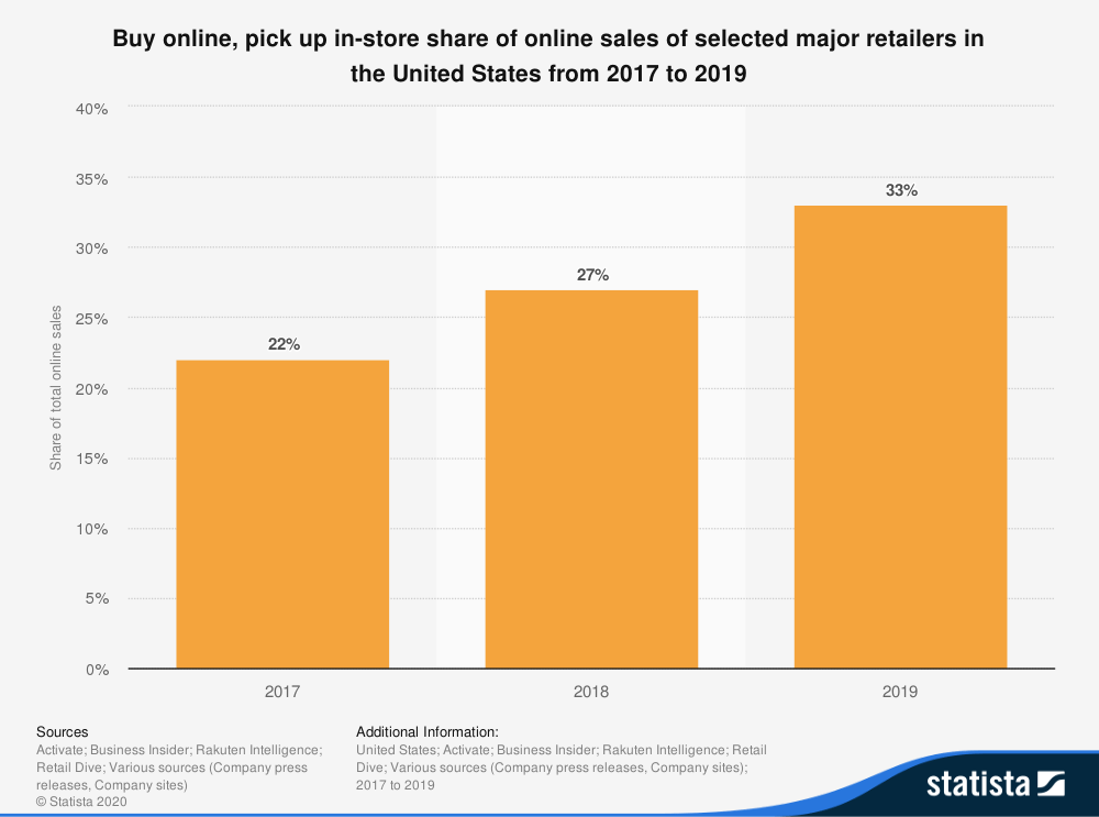This chart from Statista shows the steady increase in BOPIS share of online sales from selected U.S. retailers.