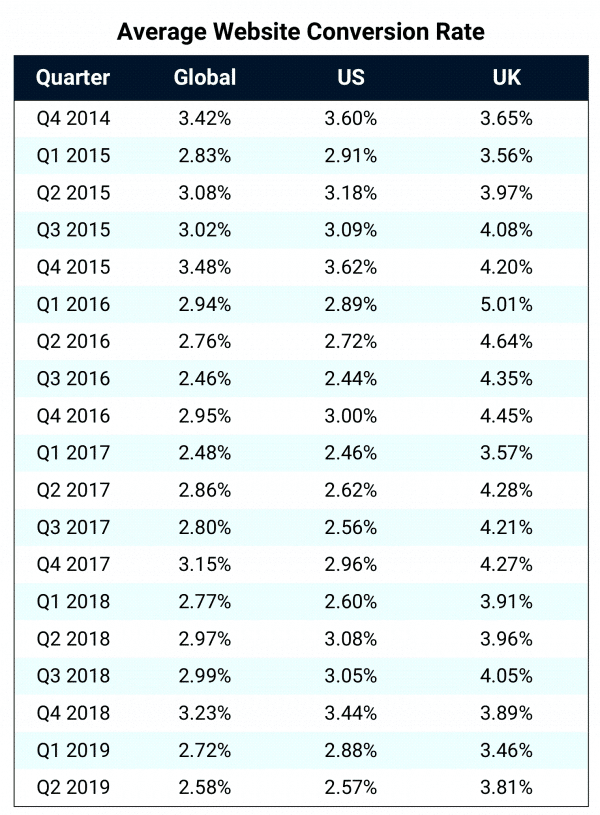 A simple to understand metric, this simply refers to the % of customers who make a purchase after visiting your site. Averages for ecommerce sites vary from around 2% to 5% so this is what you should be looking to achieve or even outperform.