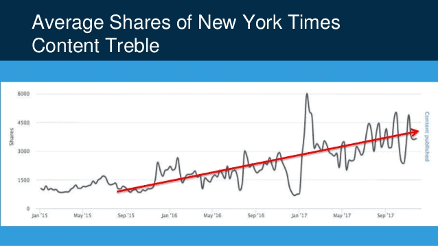However, some sites have found a way to not only weather the storm, but actually improve and see an uptick in traffic. The sites still earning social shares are the ones who have made a name for themselves as authoritative, original sources of content. Here’s an example showing the increased social shares for The New York Times: