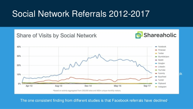 Facebook used to be the largest driver of social referral traffic. However, this graph clearly shows the recent and steady decline in Facebook shares: